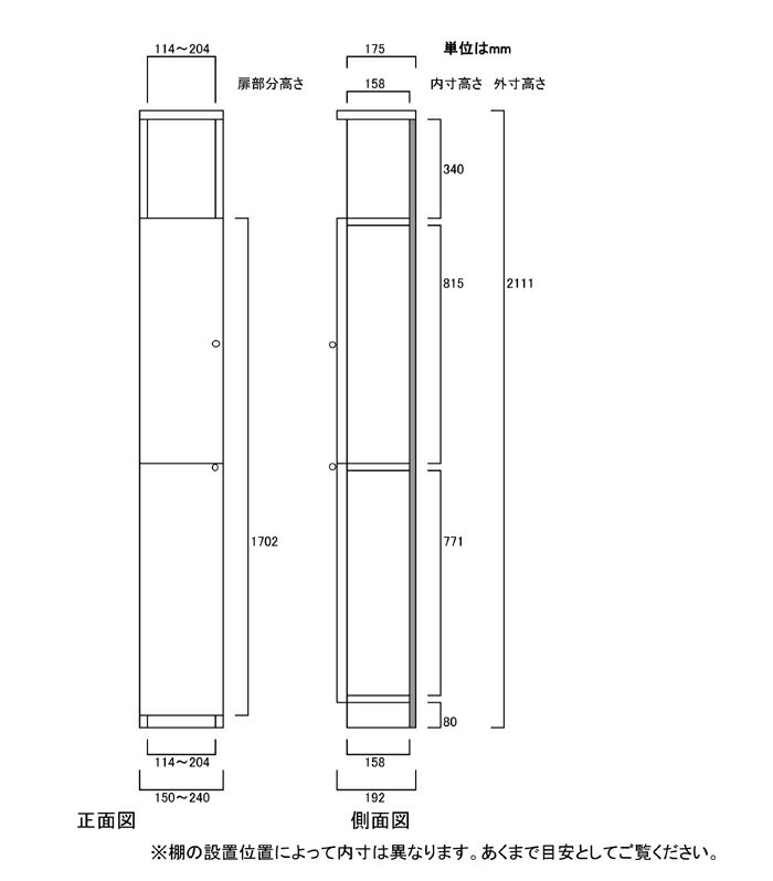 下部扉薄型家具高さ211.1cm幅15〜24cm奥行19cm上下片開き 扉高さ170.2cm 扉付勉強部屋収納 薄型家具