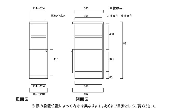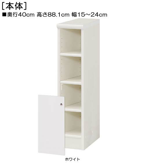 商品仕様 ■タイプ: 扉付 標準棚板(棚板厚さ1.7cm)タイプ 片開き ■棚板耐荷重: 10kg ■外寸: 奥行40cm×高さ88.1cm×幅15〜24cm (幅は1cm単位でオーダーできます) ■外寸(幅): 15cm 16cm 17cm 18cm 19cm 20cm 21cm 22cm 23cm 24cm ■扉高(実寸): 41.5cm ■棚板枚数 移動棚板:2 移動固定棚板:1 共通仕様 ■材質: プリント化粧繊維板 ■塗装: ウレタン樹脂塗装 ■素材: ホルムアルデヒドの発生を最小限に抑えた基材・芯材・プリント紙・接着剤(F☆