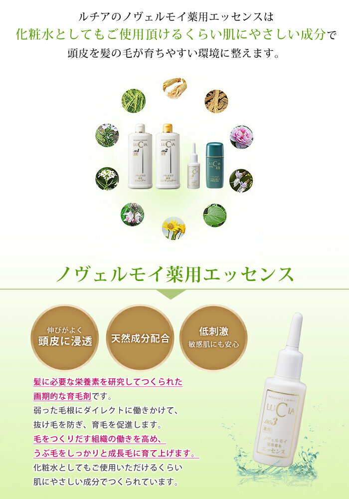 育毛剤 (女性用 男性用) メーカー希望小売価格はメーカーカタログに基づいて掲載しています(PDF) 商品名ノヴェルモイ薬用育毛エッセンス(育毛剤:携帯タイプ)お得な4箱セット 内容量18ml×7本×4箱 [約240日分] 用途男女共用 効果・効能脱毛予防、育毛、養毛、毛生促進、病後・産後の脱毛予防、ふけ・かゆみを防ぐ 医薬部外品承認番号【20800DZZ10940000】 成分グリチルリチン酸2K※、ピリドキシン塩酸塩※、ニンジンエキス※、天然ビタミンE、ヒアルロン酸Na-2、加水分解コラーゲン末、オリーブ葉エキス、オウゴンエキス、アボカドエキス、リンゴ果汁、BG、イノシット、濃グリセリン、米ヌカスフィンゴ糖脂質、DL-PCA・Na液、 牡丹エキス、延命草エキス-1、シナノキエキス、アルニカエキス、オドリコソウエキス、オランダカラシエキス、ゴボウエキス、セイヨウキズタエキス、ニンニクエキス、マツエキス、ローズマリーエキス、ローマカミツレエキス、キサンタンガム、水素添加卵黄レシチン、卵黄リゾホスファチジルコリン、エタノール、ゲラニオール、POE硬化ヒマシ油、パラベン、フェノキシエタノール、pH調整剤 ※印:有効成分※印のないもの:その他成分 生産日本 メーカー(製造)株式会社ルチア0120-171717 広告文責メーカーに同じ 区分医薬部外品 ギフト対応 【楽ギフ_包装選択】【smtb-TK】【送料無料】育毛剤 女性用 男性用 現在、在庫一掃セール中です。